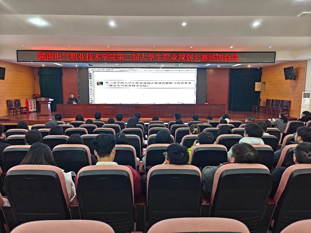 2025年12月9日下午,湖南电气职业技术学院第三届大学生职业规划大赛专题培训会在新能源五楼报告厅举行。本次培训特邀全国大学生职业规划指导专家王晓明授课,旨在提升参赛学生的职业规划能力与参赛水平。各二级学院推荐的百余名参赛师生参加了培训。培训会由招生就业处处长阳桂桃主持。